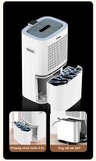 Với bình chứa nước lớn 5.5 lít, giúp máy có thể hút ẩm trong thời gian dài mà không cần phải thường xuyên đi đổ nước. Máy cũng sẽ dừng hoạt động khi bình đầy nước.