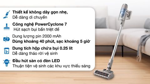 - Máy hút bụi không dây ứng dụng công nghệ PowerCyclone 7 tạo luồng khí mạnh lên đến 660 lít/phút với mức sử dụng pin tối thiểu. Lực hút mạnh mẽ giúp hút sạch bụi bẩn triệt để, đặc biệt là ở trên sàn cứng.