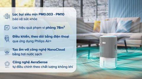 Máy lọc không khí và tạo ẩm Philips AC3420/10 là thiết bị 2 trong 1 vừa lọc không khí vừa tạo ẩm với lọc 3 lớp HEPA, than hoạt tính và công nghệ NanoCloud, loại bỏ 99,97% bụi mịn, vi khuẩn và virus, đồng thời lưu lượng gió 300m³/h và tạo ẩm tự nhiên 650 ml/giờ. Thiết kế nhỏ gọn, sang trọng, vận hành êm ái, tiết kiệm điện và điều khiển cảm ứng và dễ dàng qua ứng dụng Philips Air+ hoặc giọng nói, mang đến không gian trong lành, an toàn và thoải mái cho cả gia đình.